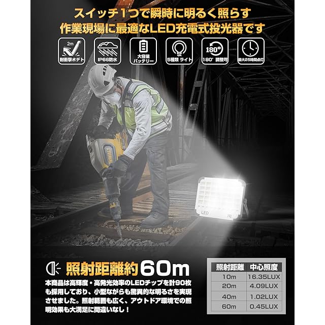 【26000mAh大容量バッテリー・最大25時間連続使用が可能】新世代のLEDライトは使用寿命500,00時間以上に達し、周囲の暗闇を切り開き、夜間であっても昼間のように感じられます。サイズ:Φ210*175*55mm 重量:約2kg(単品) 26000mAh大容量リチウムバッテリーを内蔵しており、電池交換の手間が無し。50%自然色モードで25時間以上、100%自然色モードで15時間連続使用可能!フル充電後、最大約25時間の連続稼働ができます(乾電池次第)。また、USB充電式なので、ACアダプター、モバイルバッテリーなどを利用し、手軽に充電ができます。充電して何回も使える充電式は、環境への 負荷を抑えることができるからです。充電式 led投光器としては、どこでも楽々で持ち運びやすくて、充電が長持ちで週末一泊二日のアウトドア用も安心して使えます。注意事項:ご使用前に完全に充電してください。