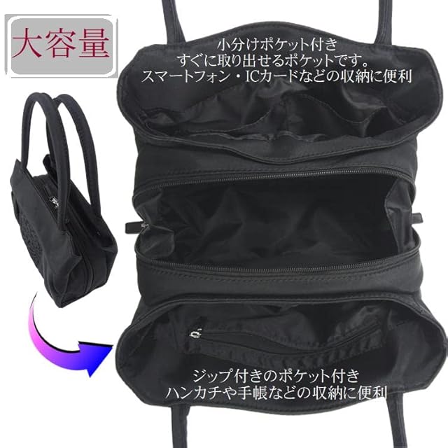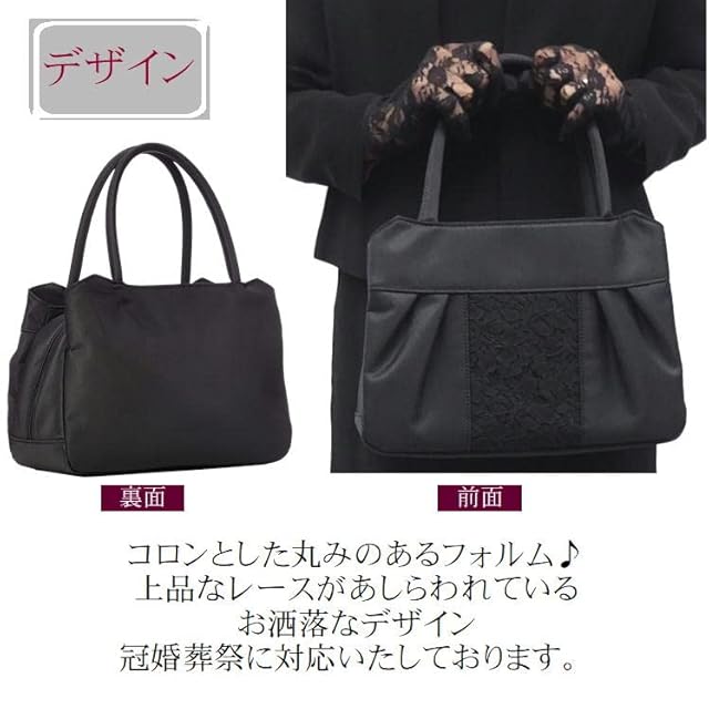 【ブラックフォーマル バッグ】<br>【ブラックフォーマル バッグ】<br><br>おくやみの席でお使いいただけるフォーマルバッグ<br>慶弔両用ですので、永く使って頂けます。<br><br><br>・デザイン <br>様々なシーンに馴染む、コロンとした丸みのあるフォルム<br>上品なレースがあしらわれており、おしゃれなデザイン<br>冠婚葬祭に対応いたしております。<br><br><br>・素材<br>光沢を控えた生地で、装飾の付いていないシンプルなデザイン。<br>撥水加工が施されているので外出先での急な雨も安心です。<br>少量の雨でしたら防ぐことができ、バッグの中が濡れません。また汚れも付きにくく、お手入れも簡単です。<br><br><br>・様々なシーンで幅広い年齢層の方に<br>品位あるデザインは年齢を問わず気品のある貴方を演出します。<br>結婚式、入学式、卒業式、入園式、卒園式にも、あらゆるシーンでお使いできます。<br><br><br>・丈夫で軽量<br>丸型で幅があるので、長財布や化粧ポーチなどもしっかり収まります。<br>素材も縫製もしっかりしている頑丈な造りになっており型崩れしにくい丈夫なバッグです。<br>軽量だから、持ちやすく、持ち手も握りやすく疲れにくいものになっております。<br><br><br>・大容量の収納力<br>見た目以上にたっぷり収納できる大容量のフォーマルバッグ、ふくさ、念珠、スマホ、<br>お財布、化粧ポーチ、折りたたみ傘なども、入ります。<br>マチが広くて使いやすいバッグです。<br><br><br>・大きく開いて出し入れ簡単!使いやすい!<br>収納力抜群で、取り出したいものが、すぐに出せる設計です。<br>がばっと大きく開くので中が見えやすく、3つに仕切られたポケットで、小物を整理出来るから、<br>念珠やふくさなども、さっと出し入れでき大変便利です。<br><br><br><br>・内側側面:ジップ付きのポケット付き<br>ハンカチなどの収納に便利です。<br><br><br>・内側側面:小分けポケット付き<br>すぐに取り出せるポケットです。<br>スマートフォンなどの収納に便利です。<br><br><br> ※商品詳細<br> 表地: ポリエステル<br> 裏地: ポリエステル<br> レース部分:綿・ナイロン・レーヨン<br> 開閉:ダブルファスナー<br> サイズ(約)タテ21×ヨコ29×マチ11cm<br> ポケットの数:(外側0/内側3)<br> 重量(約)360g<br> 持ち手の長さ(約)38cm<br> 中国製<br><br>