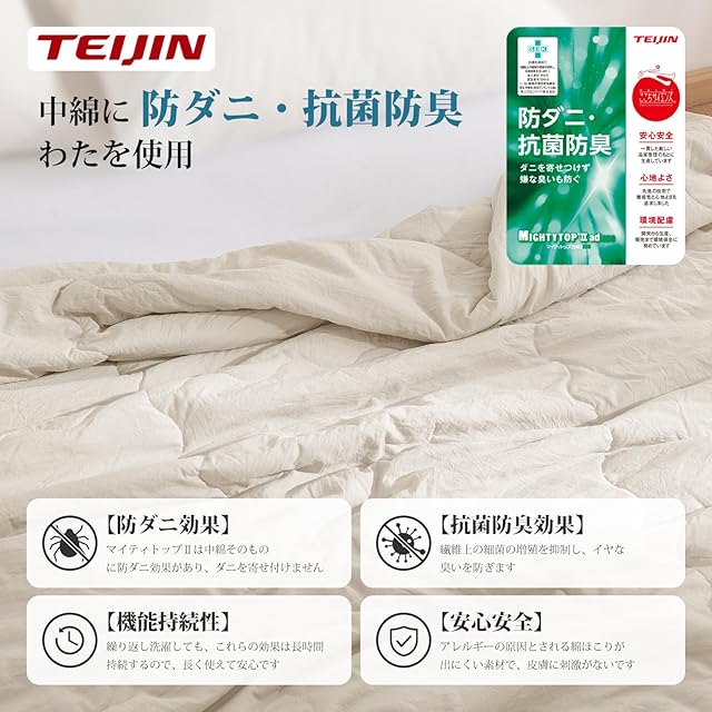 ☁ 中綿に防ダニ・防菌防臭のTEIJIN綿を使用しているので、細菌の増殖を抑制し、イヤな臭いを防いで、アレルギーの体質の方にも適しています。