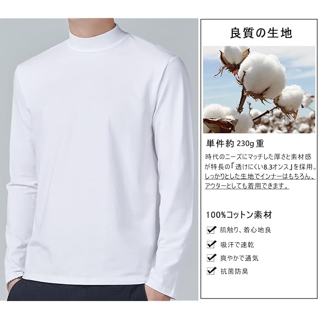 シンプルで使いやすい白のタートルネック長袖Tシャツです。肉厚な綿100%素材を使用し、秋冬春の季節に快適な着心地を提供します。3枚セットでご用意しており、デイリーローテーションに便利です。高品質な縫製で、首元はストレスフリーなフィット感。吸水性が高く、速乾性にも優れているため、インナーとしても活躍します。シンプルなデザインで、カジュアルからビジネスまで幅広いコーディネートに対応可能。豊富なサイズ展開で、体型を問わず快適にお使いいただけます。一年中活躍する定番アイテムとして、クローゼットに常備しておきたい一着です。
