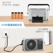 便利な電源供給:ポータブルラジオはAC電源と乾電池(単4)の両方に対応しています。室内ではAC電源を使い、外出先やキャンプなどのアウトドアでは乾電池を使用することができます。使い勝手の良さが魅力です。