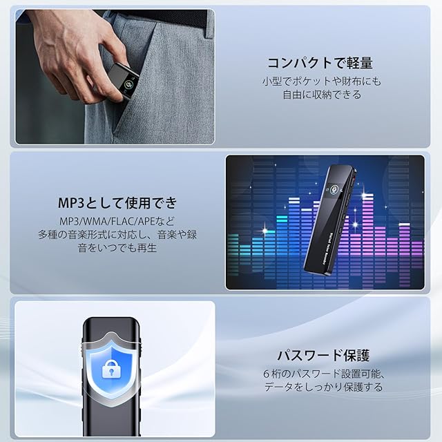 【多彩な便利機能を備えたicレコーダー】録音の他に、パスワード保護、リピート再生や変速再生など機能も搭載しており、様々なニーズに応えるicレコーダーです。また、MP3/WMA/FLAC/APEなど多種の再生音楽形式に対応し、icレコーダーだけでなく、MP3プレーヤーとして音楽再生はできます。更に、録音自動保存機能により、録音中にバッテリー残量が不足している場合は、自動的に録音ファイルを保存でき、データが消える心配はありません。