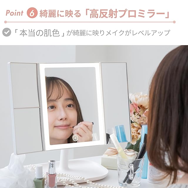 【かわいい・多機能】ミラーの全面をレザー調のデザインと、おしゃれでかわいい外観としました。明るさ無段階調光 3光色(昼光食/昼白色/電球色)、リチウムイオンバッテリー、3種類の拡大率(1/2/3倍)など、卓上ミラーを楽しくご利用頂ける機能を搭載しました。