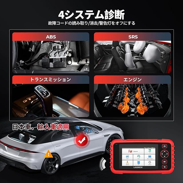 【4システム診断】Launch CRP129XV2.0 OBD2 診断機は、エンジン、トランスミッション、ABSおよびSRSの車の4大システム診断に使用できます。BMW,ベンツ、アウディ、プジョーなどの輸入車やトヨタ、スズキ、日産、スバル、本田など日本車など10000+の車種に対応します。(ご注意:ダイハツは非対応) CRP129XV2.0 スキャンツールは故障コードのの読み取り/消去、ライブデータストリームの表示、フリーズフレームの確認、チェックエンジンランプ、エアバックなど関連する警告灯の消灯ができます。