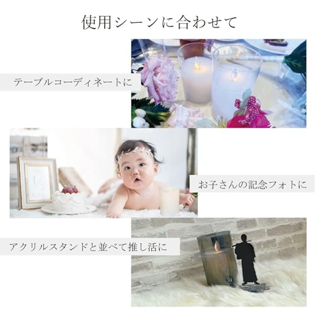 【注意事項】・本製品は本物の蝋を使用しております。 ・本体を火気に近づけたり、火を点けたりあぶったりしないでください。 ・紫外線による退色・変色を避けるため、直射日光のあたる場所を避け、涼しいところで保管してください。 ・キャンドル本体用の電池は付属しておりませんので別途ご購入下さい。※専用リモコン用の電池はモニター用として付属しております。 ・本製品の色合い、形など、キャンドルごとに個体差があります。 ・性質上、本体に衝撃を与えると破損するおそれがありますのでご注意ください。 ※商品は、モニターによって色合いが異なって見える場合があります。 ※仕様・デザインは改良のため予告なく変更することがあります。