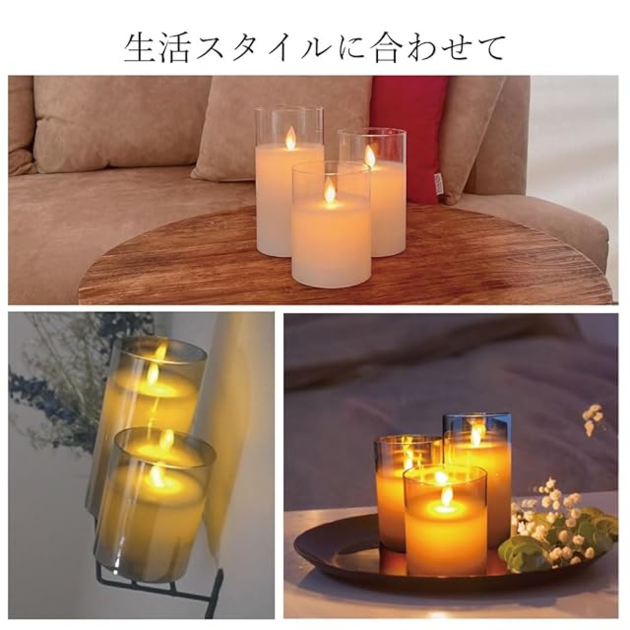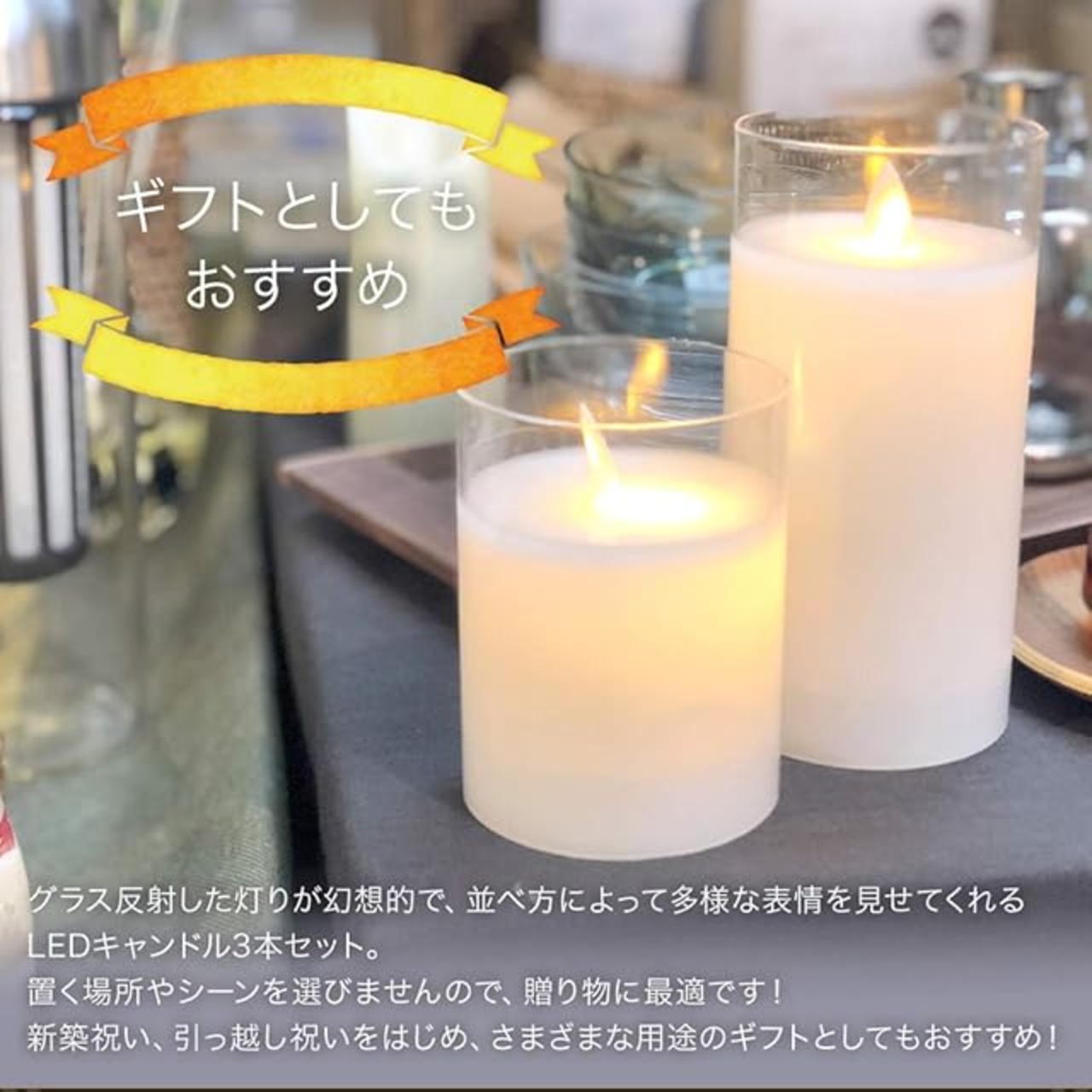 【商品仕様】サイズ:L(直径7.4cm×高さ15cm)、M (直径7.4cm×高さ12.5cm)、S(直径7.4cm×高さ10cm)、個数:3個/点灯モード:揺らぎ・一定 キャンドル本体の電池:単3電池(各2本・別売り) リモコン用電池:ボタン電池1個(付属)