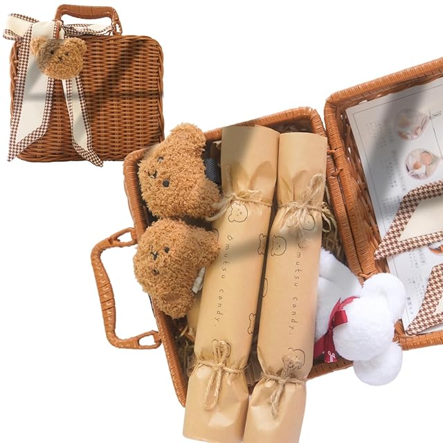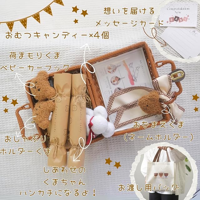 キャンディー風に包んだオムツとくまちゃんアイテムに可愛いバスケット付きの出産ギフトセットです。産後1ヶ月〜7ヶ月まで使いやすいオーガニックのオムツが4点入り。くまちゃんはおしゃぶりホルダー、ベビーカーにつけてお荷物下げとして使うバギーフック、ネームホルダーにもなる可愛いくまちゃんのストラップがの3点。 ギフトらしく、くまちゃんの姿に作り込んだハンカチ(タオルベア)が添えてます。赤ちゃんだけではなく親子一緒に楽しめるギフトなっております。レターメッセージで日頃お世話になっているあの人へ感謝の気持ちを伝えましょう。特徴的なバスケットは人の手で一点一点作ってます。 開けた瞬間からワクワクを感じて貰えます。更に置くだけで、インテリアとしてお部屋を可愛く演出してくれます。 赤ちゃんが大きくなったらピクニックのかご、ぬいぐるみ入れなど、様々な用途としてもお使い頂けます。