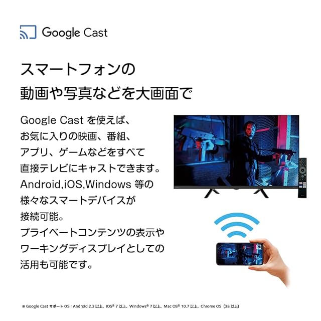 スマートフォンの動画や写真などを大画面でGoogle Cast を使えば、お気に入りの映画、番組、アプリ、ゲームなどをすべて直接テレビにキャストできます。Android,iOS,Windows 等の様々なスマートデバイスが接続可能。プライベートコンテンツの表示やワーキングディスプレイとしての活用も可能です。