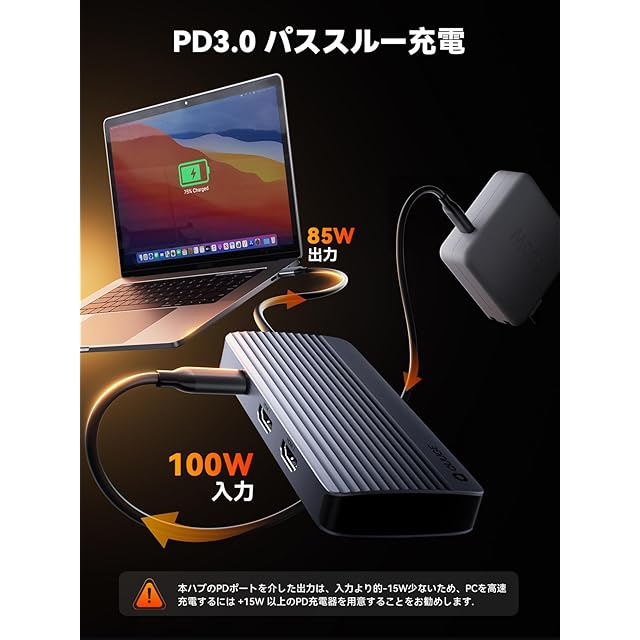 【PD急速充電】Power Delivery 3.0 に対応したドッキングステーションは、お使いのノートパソコンに最大85Wの急速充電をします。USB-Cポートが一つしかないMacbookなどに最適、電池切れの心配はありません。急速充電しながらも他のポートを用いた作業が可能です。(ご注意:本ハブのPDポートを介した出力は、入力より的-15W少ないため、PCを高速充電するには +15W 以上のPD充電器を用意することをお勧めします。)