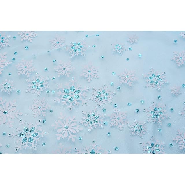 きらきら雪の結晶がプリントされたマントと鮮やかライトブルーに、ラメたっぷり、煌めくドレスです。 さらにシルバーのティアラ等付きで、ゴージャスなお姫さまに変身!