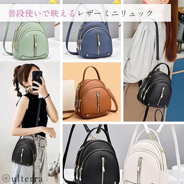 ulterra(ウルテラ)からリュックタイプはもちろん、ワンショルダー、バッグのように手持ちと3wayスタイルのレザーミニリュックが登場!小さめでかわいらしい見た目だけではなく、高級感も大事にしたミニリュックです。ショルダーストラップもバッグ本体と同じ素材を使用し、安っぽさを感じさせないレディースリュックに仕上げました。金属パーツは全てゴールドで統一し大人っぽく上品にまとめています。高校生や大学生などの学生の方の通学時はもちろん、社会人の女性の通勤時にもお使い頂ける、きれいめのミニリュックです。 素材のPUレザーは他の合皮素材に比べて弾力性や柔軟性、耐久性において優れています。中でも今回採用しているPUレザーは厚みがあり、なめらかな肌触りと適度な弾力を合わせ持ったものを使用。また本革に比べてお手入れが不要というメリットもあります。 リュックにはメインポケットとサブポケット、合わせて3ヶ所の収納を装備。スマホや財布など生活に不可欠な小物はもちろんイヤホンやUSBケーブルなどもスマホ等の本体はリュックに収納したまま、背面につけられた小穴からコードのみを通して使用できます。