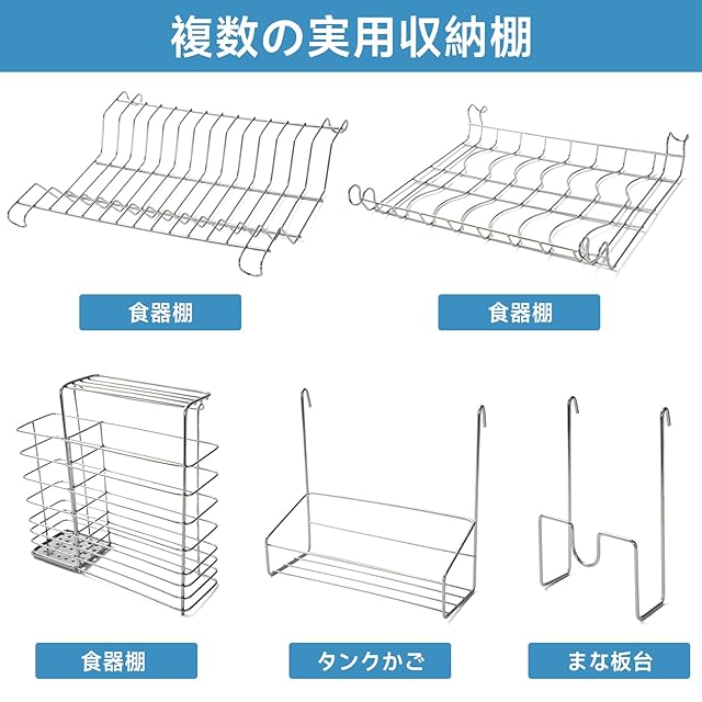 ⭐まな板受け、箸立て&包丁差し、水きりかご、Sフックなど便利な小物が付属。キッチンで使う小物もたくさん載せられるので、使い勝手抜群です。引っ掛け式ですので、左右どちら側でも取り付けが可能