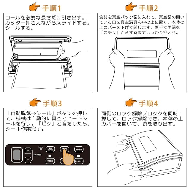 【使用上のご注意】※※※初めて使用する前、サポートブロックを取り出してください。両手で両端を「カチッ」と音するまでしっかり蓋を押してください。※※※吸引&密封する場合は、必ず真空パック専用袋(表面凹凸エンボス加工)を使用してください。一般のポリエチレン袋では空気の吸引はできません。※※※真空パックできない場合は、下記の内容をチェックしてください。袋の開口部を真空溝真ん中の上に置いて、溝を超えないください。脱気口を覆わないでください。※※※ご使用の前に必ず本書「取扱説明書」をよくお読みください。説明書に記載している通り、作業終わったら、ロックせずに保管してください。ロックして保管した場合、スポンジを圧縮され、圧着不良の原因となります。※※※汁物は冷凍して固まってから真空パックしてください。