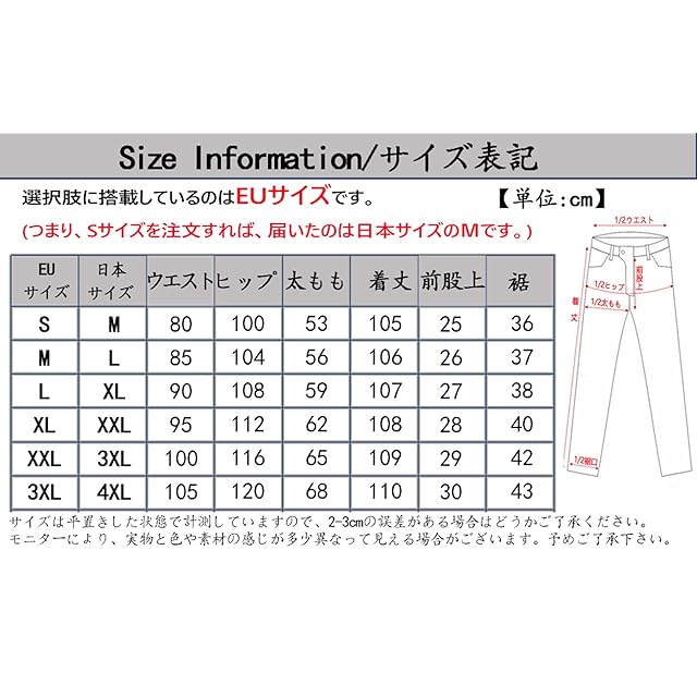 サイズ表記:<br> バイク レザーパンツ レザーパンツ ライディングレザーパンツ バイク用革パンツ<br> S: ウエスト80cm ヒップ100cm 着丈105cm 太もも46cm 股上25cm 裾36cm<br> M: ウエスト85cm ヒップ104cm 着丈106cm 太もも48cm 股上26cm 裾37cm<br> L: ウエスト90cm ヒップ108cm 着丈107cm 太もも50cm 股上27cm 裾38cm<br> XL: ウエスト95cm ヒップ112cm 着丈108cm 太もも52cm 股上28cm 裾40cm<br> XXL: ウエスト100cm ヒップ116cm 着丈109cm 太もも54cm 股上29cm 裾42cm<br> 3XL: ウエスト105cm ヒップ120cm 着丈110cm 太もも58cm 股上30cm 裾44cm<br> ご注意:<br> ※サイズは平置きした状態で計測しています。2-3cmの誤差はご了承ください。<br> ※モニターにより、実物と色や素材の感じが多少異なって見える場合がございます。予めご了承下さい。<br>