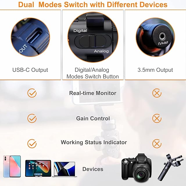 【デジタル/アナログ出力モード】VM10 PRO最新アップグレード!2種類のモード切替が可能で、応用範囲が広いです。3.5mmとUSB端子を持つ設備に幅広く対応します。USB Type-Cと3.5mmマイクケーブルを同梱し、iPhone、Androidスマートフォン、ノートパソコン、一眼レフカメラなどに対応。