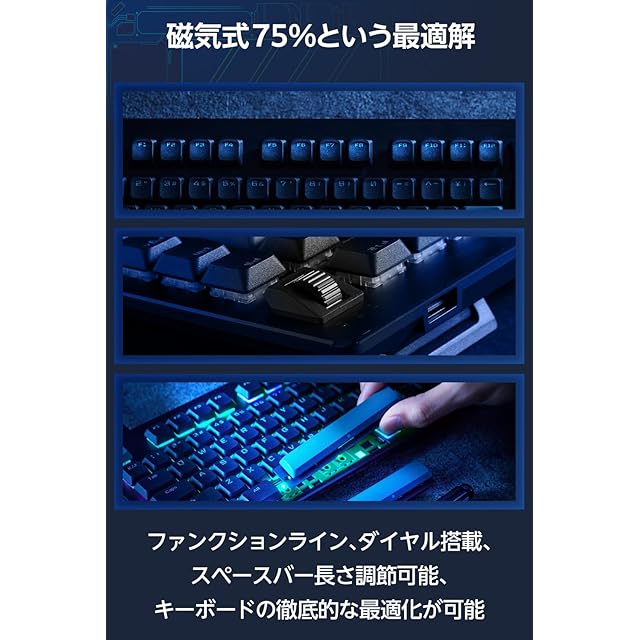 最短0.1mmの押し込み・押し上げでキー入力のON/OFF操作ができる、磁気式アナログ検知スイッチ(磁気スイッチ)搭載。スペースバーユニットの選択、ワンアクションでのプロファイル切り替えなど、勝つために最適な設定をアレンジできる、75%サイズゲーミングキーボード ロープロファイルスイッチ搭載モデルです。
