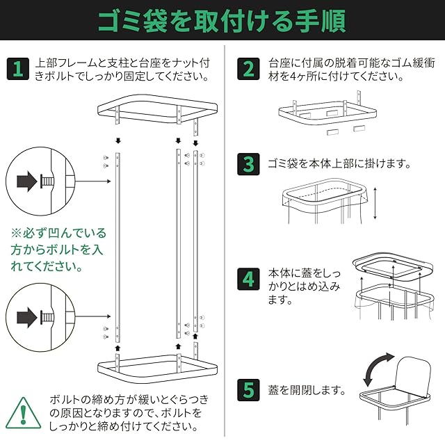 シンプルな構造&フタ付きで臭いを軽減:フタとフレームだけの構造なので、狭いスペースにもラクラク入る。フレームがゴミを潰さないので、よりたくさんのゴミを入れることができます。また、安定性を高めるため、土台にはクッションを取り付けて使います。クッションが床を守ってくれるので、たくさんゴミを入れて重たくなっても安心です。フタを閉めることでイヤな臭いを外に漏らしにくい構造になっています。おむつや生ごみなど、臭いの気になるゴミも安心です。※例:30Lのゴミ袋をセットして、500mlのペットボトルが10本入っていますが、まだまだ余裕があります。※