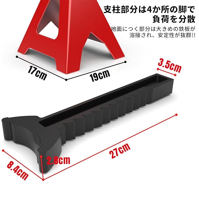 JACK BOSS 車用ジャッキスタンド 3t 2個セット 車馬 馬ジャッキ 10段階高さ設定 最低位285mm/最高位425mm リジットラック ウマ スチール製 タイヤ交換 レッド。 自宅の車メンテナンスに欠かせない製品!タイヤ交換やオイル交換などの作業時には欠かせないジャッキスタンドです。ジャッキスタンドは丈夫な高品質の鍛造鋼を使用し、溶接されたフレーム設計と防錆コーティングにより耐久性を高めています。ジャッキアップした車を支えるジャッキスタンドは4脚マットの設計で安定感を与えます。馬ジャッキの最大耐荷重は3トン、小型の個人車、オフロード車やバイクなどを取扱うことができます。初心者でも簡単に使用できます。初心者でも簡単に使用できます。作業によっては2台もしくは4台必要となります。使用しやすいように設計されており、レバーが上に上がると、ラチェットの高さを調整できます。持ち運びにも便利です。ガレージジャッキなどで持ち上げた車体を支え、より効率的な作業を行うことが出来ます。 4脚の支柱でしっかり支えるのでグラつきも無く安定感に優れています。頑丈で耐久性があるので、安心して作業をすることができます。 【使用方法】 レバーを上に上がって、センターコラムを必要な高さまで上がる、確認後レバーを下がって、それでロックされます。 U字穴のところを叩き込んて、センターコラム落ちないように固定して、安定性が上がります。 シンプルで丈夫で機能的なデザイン。 安全ロックシステム。 安定性を高めるための大きなベース。 長寿命で長持ちする耐久性のある構造。 頑丈な溶接構造。 ラックによる10段階の高さ調整。 趣味のワークショップに最適。 幅広の調節可能な足-作業場の床にやさしく、最大限の安全性を提供します。 片手レバーによる迅速な高さ調整。 パッケージは以下を含みます: ▪2xジャッキスタンド。 【注意事項】 絶対にジャッキの呼び荷重を超えた荷物を持ち上げないでください。 ジャッキの底面は常に固い、水平な平面の上に置いてご使用ください。 当商品は入荷の時期によりカラー/仕様などが変更される場合があります。予めご了承下さい。 入荷状況により細かな仕様変更がある場合がございますがご了承ください。 検品確認済みですので破損以外の交換には応じられません。商品到着時にはその場で開封、破損の有無を確認し、破損の場合には受け取らないか配送業者に申し出てください。