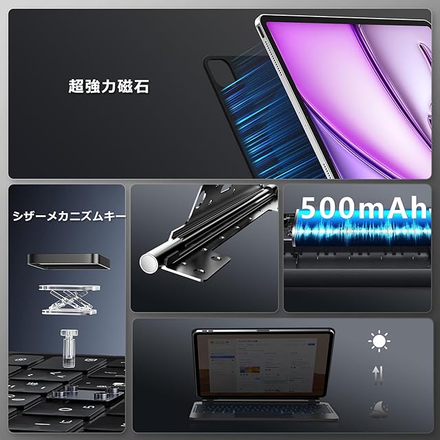 【強力磁気設計&角度調整】マジックキーボードの背面カバーとiPadカメラ位置を合わせるだけで一秒間で磁気吸引、iPadをしっかりと固定することで、あらゆる場面でしっかりと保護することができます。ケースは強力な亜鉛合金ヒンジにより、iPadの重さでひっくり返らない位置まで自分の見やすい位置にスムーズに角度調整が行えます。