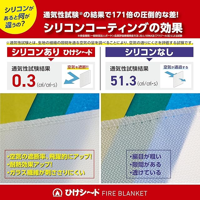 ガラス繊維のシートに窒息消火の効果を高めるシリコンコーティングを施しています。消火器に次ぐ「セカンド消火ツール」として最適です。