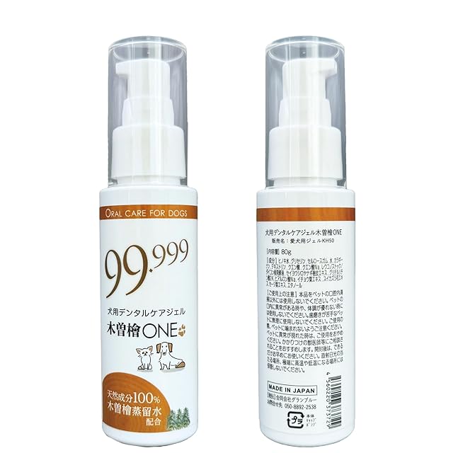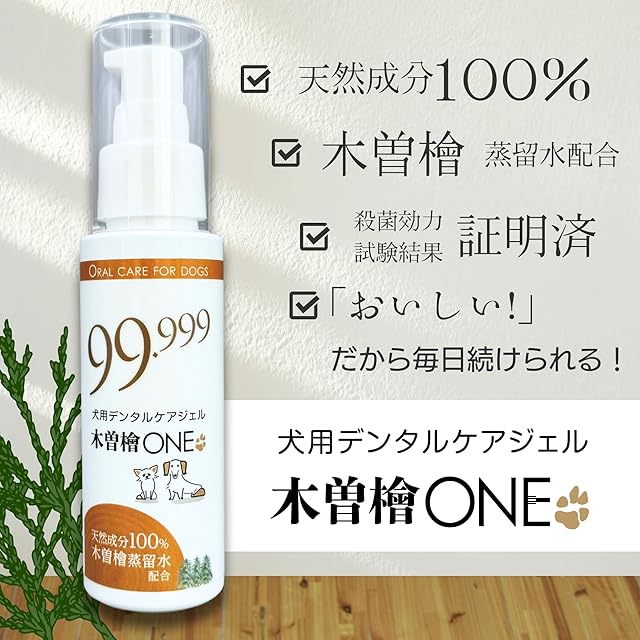 愛犬の健康は私たち飼い主にとって何よりも大切です。 歯周病を放置すると愛犬の寿命に直接影響を与える恐れがあります。歯が抜けるだけでなく、歯周病菌が体内に入り、腎不全や動脈硬化などの内臓疾患を引き起こすことが知られています。犬はうがいができないため、日頃からの口腔ケアが特に重要です。 長野県木曽地方で300年以上かけて育てられた木曽檜の蒸留水を約50%含み、天然成分100%で作られたこの「木曽檜ONE」は、歯周病菌を99.9%除去する驚異の効果が公的な検査で証明されています。 研磨剤・発泡剤・合成香料・着色料は一切使用しておらず、木曽檜の自然な香りがするだけです。味も香りもつけていませんが、どのワンちゃんも大喜びで舐めることが確認されています。 使い方は非常に簡単です。ブラシを使うことなく、ジェルを指でやさしく歯茎に塗るだけで簡単に口腔ケアが可能です。それも難しいワンちゃんの場合、口の周りに塗って舐めさせるだけでもオッケー。 愛犬の健康と長寿のため、今こそこの「木曽檜ONE」を始めてみてください。