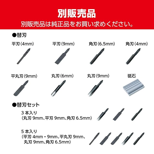 付属品:平刃(9mm)、角刃(6.5mm)、丸刃(9mm)、スパナ