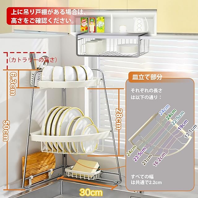 【収納と乾燥】水切りラックはキッチン用品の収納、乾燥に適しています。2段水切りかごでカウンタートップを有効に活用しましょう。1段目には、最大で7枚の皿を収納できます。 2段目には、最大5個のボウルを収納でき、限られたキッチンカウンターにぴったりです。幅(30cm)、高さ(50cm)(箸立てx1/ボウルラックx1/ディッシュラックx1/スポンジラックx1/まな板スタンドx1付き。全ての構成要素は取り外しが簡単で、耐蝕性に優れています。 )【超おしゃれ省スペース】角さえあればけっこう!キッチンスペースを増やします!この食器ラックはスペースを有効活用して、キッチンカウンターを清潔に保ちます。一人暮らし、ワンルームの狭いシンクにも適しています。視線を遮らない三角タイプで、食器の持ち運びに便利です。シンク上部のスペースを有効活用することで、作業スペースを拡大し、スムーズな洗浄が可能です。大きな台所だけでなく小さな台所にもピッタリ。優れたステンレスを採用し、見た目も綺麗な金属光沢が溢れています。キッチンに自然と溶け込むデザイン。色、質感はしっかりしているため、どんな内装スタイルにもマッチします。【耐荷重と安定性】三角構造で一般的な構造よりより堅牢になり、頑丈な金属フレームは、20kgの重さまで耐えることができます。 グラグラと揺れて食器が壊れてしまうこともありません。錆びない丈夫なラック-シンクの上の水切りラックは高級ステンレス鋼でできており、健康的で衛生的で、耐食性があり、性能に優れ、長期間使用できます。【折りたたみしきで組み立て簡単】折り畳み式、フレ一ムに引っ掛けるだけで簡単に設置できます。工具は必要ありません。ひと掛けでok!簡単に取り付け可能で、説明書を読まなくても1分以内に設置できます。【品質保証】当社ママ倉のラックは12か月の保証があります。科学的なデザインと高の品質を提供し、輸送中に製品が破損または紛失した場合は、最速で回答します。ご購入されると、絶対にご満足いただけます。