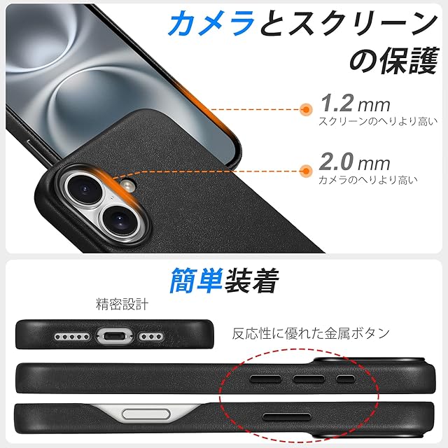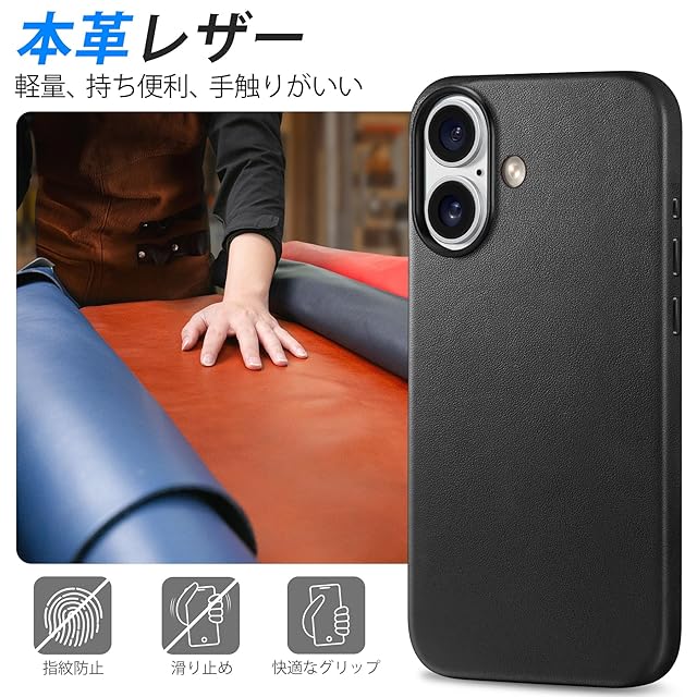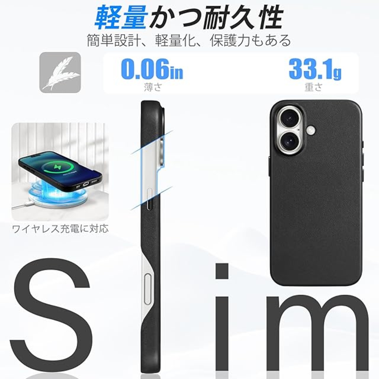 【iPhone 16対応本革ケース・ワイヤレスと磁気充電可】本商品は本革レザー素材を採用したので、簡単に装着・脱着ができて、スマホ本体をしっかり保護します。軽量且つ極薄のデザインで、長時間スマホを使用しても熱がこもらないし、ワイヤレス充電なども可能でございます。リング型の磁石が埋め込まれているので、磁気の充電器も使えます。