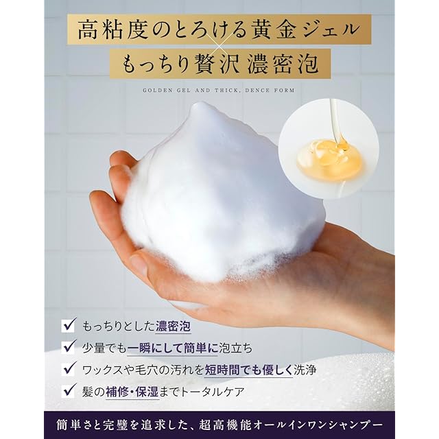 【黄金ジェル×濃密泡】濃密な泡立ちスカルプシャンプー。弾力のある泡が、頭皮を優しく包み込みながら毛穴を洗浄します。アミノ酸系洗浄成分を使用しているため、マイルドで心地よい洗い上がり。濃厚なジェルタイプなので少量でも簡単に泡立ちます。高級サロンのような、至福のひと時を。