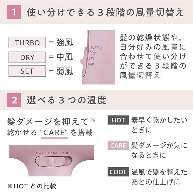 髪の乾燥状態や、自分好みの風量に合わせて3段階の風量切替えが可能です。
