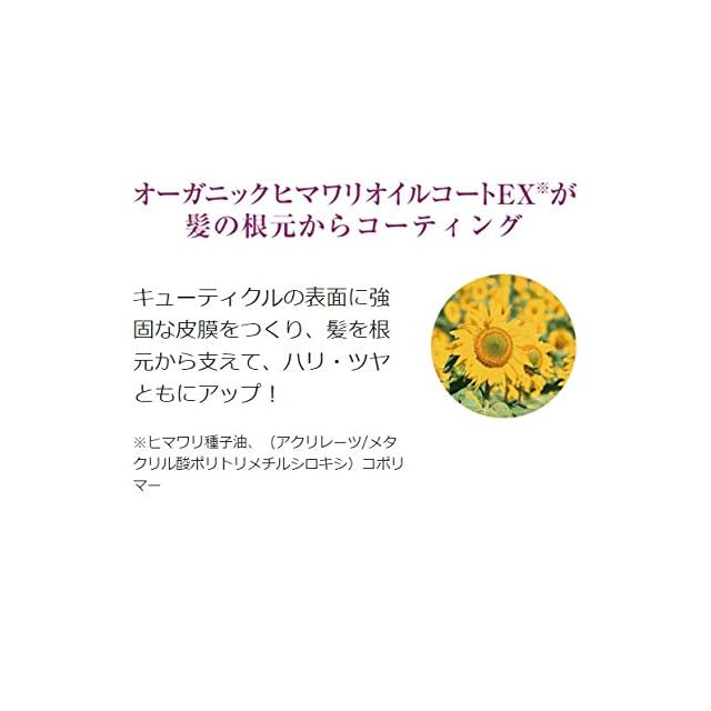 【髪の毛のハリ・コシアップ】ヒマワリオイルコートEX(※1)が、キューティクルの表面に被膜をつくり、髪を根元から支えてハリ・ツヤともにアップ。毛髪浸透型コラーゲン&シルク(※2)が、空洞ができた髪の内部までケアし、内側からコシのある髪へ導きます。※1 ヒマワリ種子油、(アクリレーツ/メタクリル酸ポリトリメチルシロキシ)コポリマー、※2 イソステアロイル加水分解コラーゲン、イソステアロイル加水分解シルク