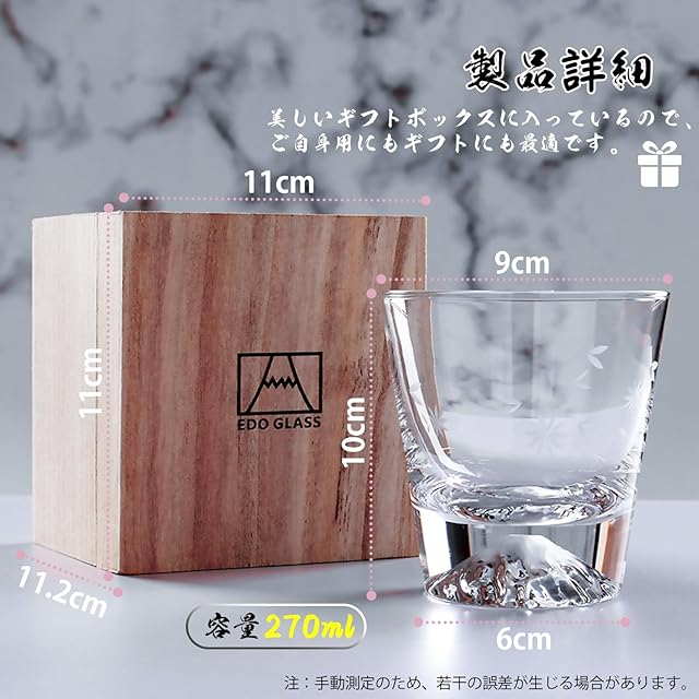 サイズ:直径約90mm、高さ約100mm、満水容量約270ml。 木箱のサイズは110mm×110mm×112mmで、梱包重量:約740g 内容:桜切子タンブラー×1 富士山タンブラー×1