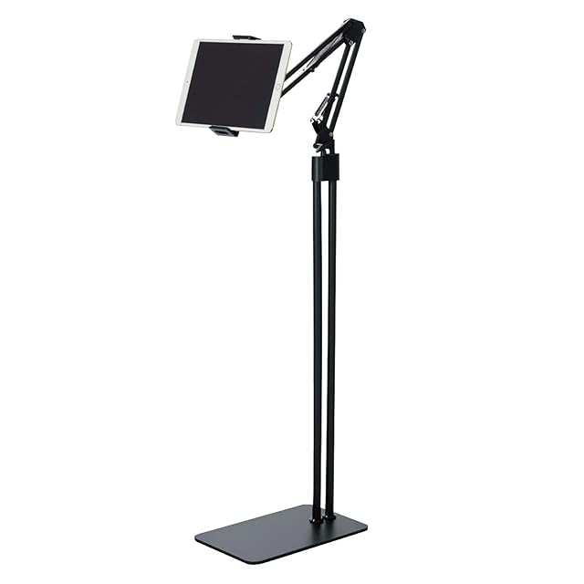 広い空間や部屋の中央でも高さを保持してスマートフォンやタブレットを使用できる床置式フレキシブルアームスタンドです。