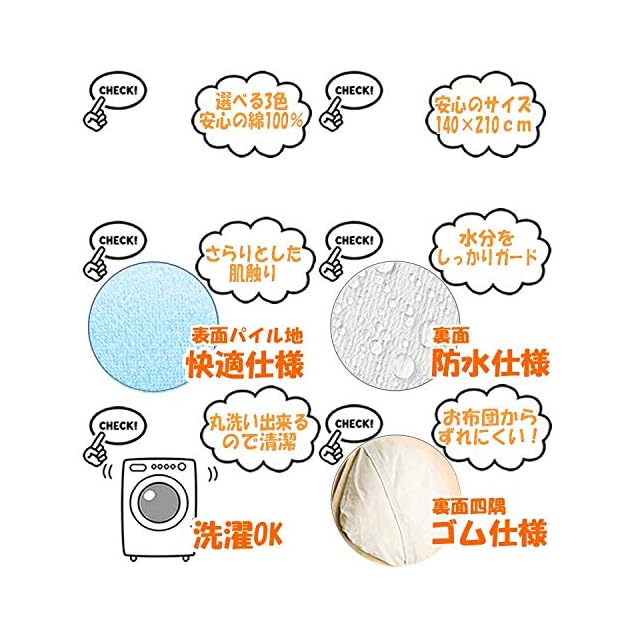 【余裕の140×210cm】 一般的な防水シーツ長さは200-205cmですが、イクズスの防水シーツは210cm。 5cm又は10cmの違いが余裕を持ってお布団全体をしっかりカバーします。 【嬉しい綿100%】 綿とポリエステル混紡製品と違いイクズスのシーツは綿100% 綿100%だからこその吸水性はとても安心です。 ※第3者機関での品質試験合格品 【厚みしっかりタイプ】 一般的にシングルサイズは製品重量600g前後の製品が多い中で イクズスのシーツは約700g。 「厚みしっかりタイプ」ですので、お洗濯時の消耗が少なく安心です。安全性、安心品質はお値段以上の価値あり!(製品重量約700gの厚みしっかりタイプ)だから洗濯機で丸洗いでも大丈夫です。高耐久高品質防水シーツ。子育て・介護・ペットのお世話に活躍します。