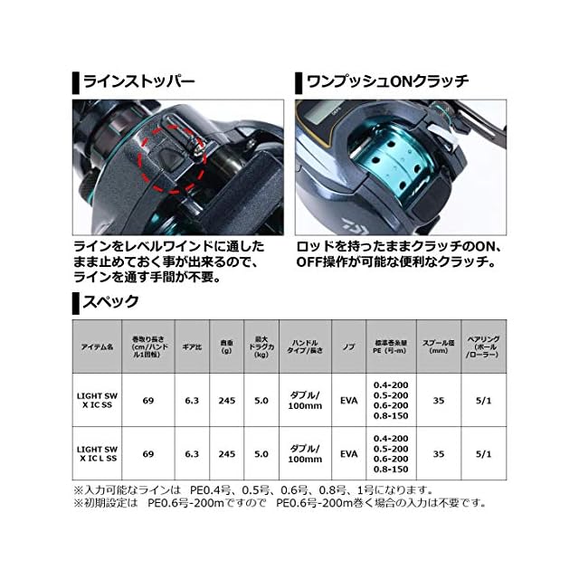 標準糸巻量 PE(号-m):0.4-200、0.5-200、0.6-200、0.8-150