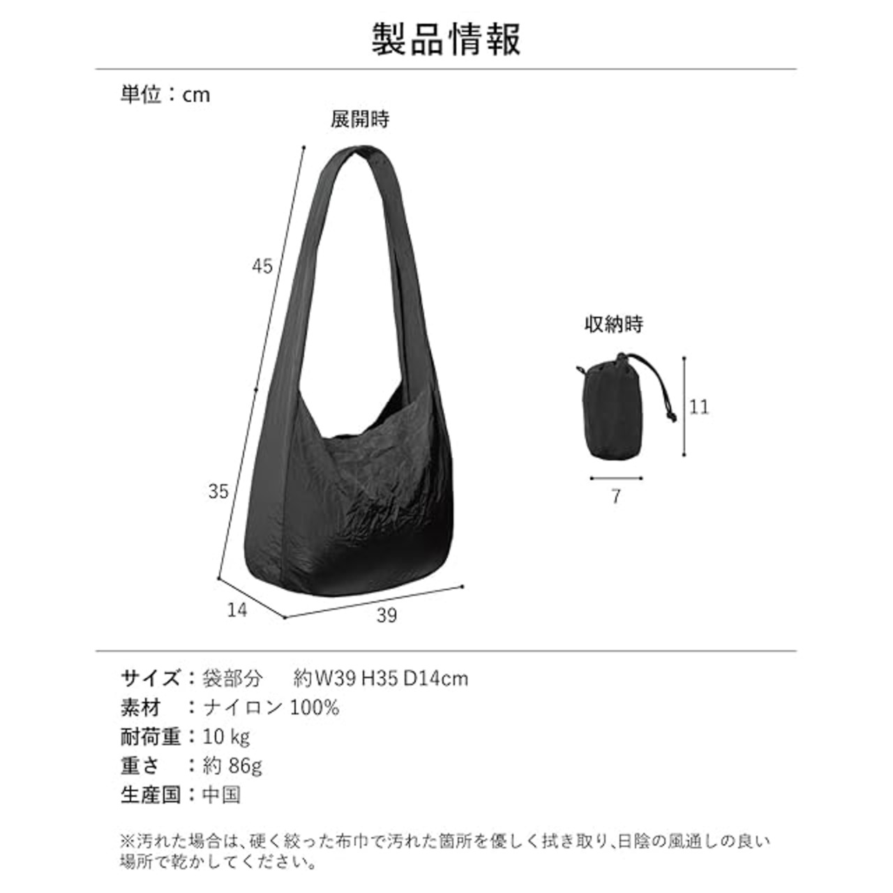 【グシャッと小さく旅の大容量ショルダー】 ①サッと出して畳まず収納:サッと出せて立ったまま、畳まず収納。使いやすさと、持ち運びやすさを両立。 ②便利な大容量:幅広な肩紐と耐荷重10kgで重い荷物でも安心。お出かけ先の急な荷物にも素早く対応。 ③上質なナイロン生地:シワ感を楽しめるマットな質感のナイロン生地を採用。普段使いでも見劣りせずご使用いただけます。 便利なループ付き:カラビナなどをつけることができる便利なループ付き。別売りのカラビナ(tps-132)をご使用していただくことで、より携帯しやすくなります。 サイズ:袋部分 W39 H35 D14cm 素材:ナイロン 100%(汚れた場合は、固く絞った布巾で汚れた箇所を優しく拭き取り、日陰の風通しの良い場所で乾かしてください。) 耐荷重:10kg 重さ:約86g 生産国:中国