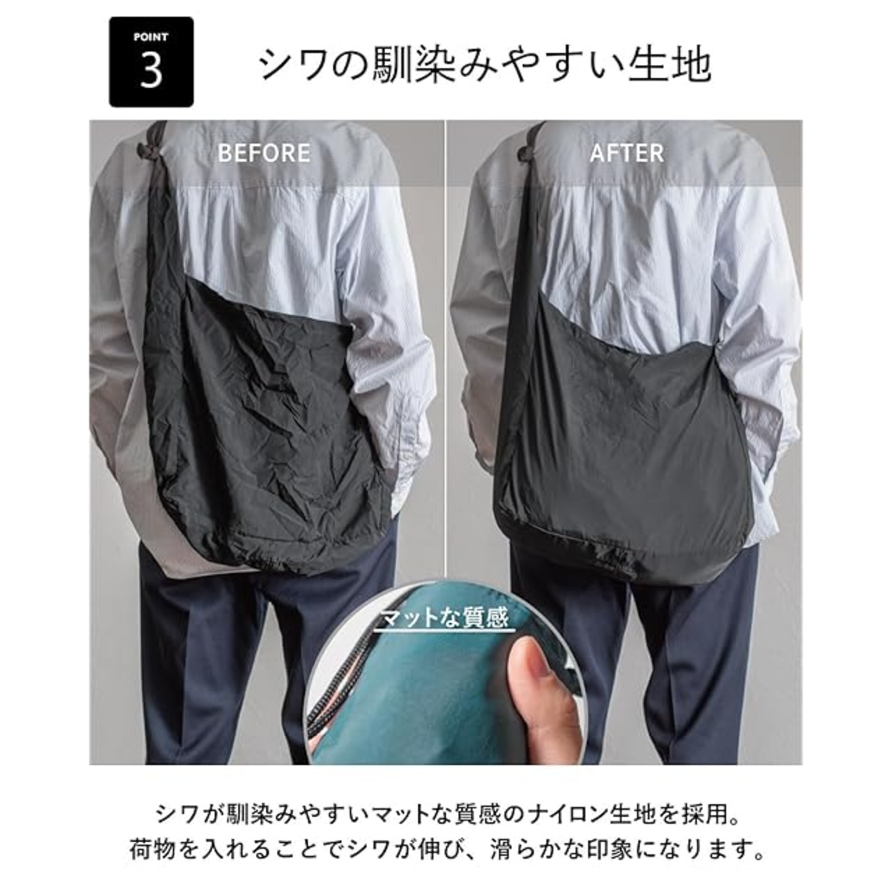 ③上質なナイロン生地:シワが馴染みやすいマットな質感のナイロン生地を採用。荷物を入れることでシワが伸び、滑らかな印象になります。