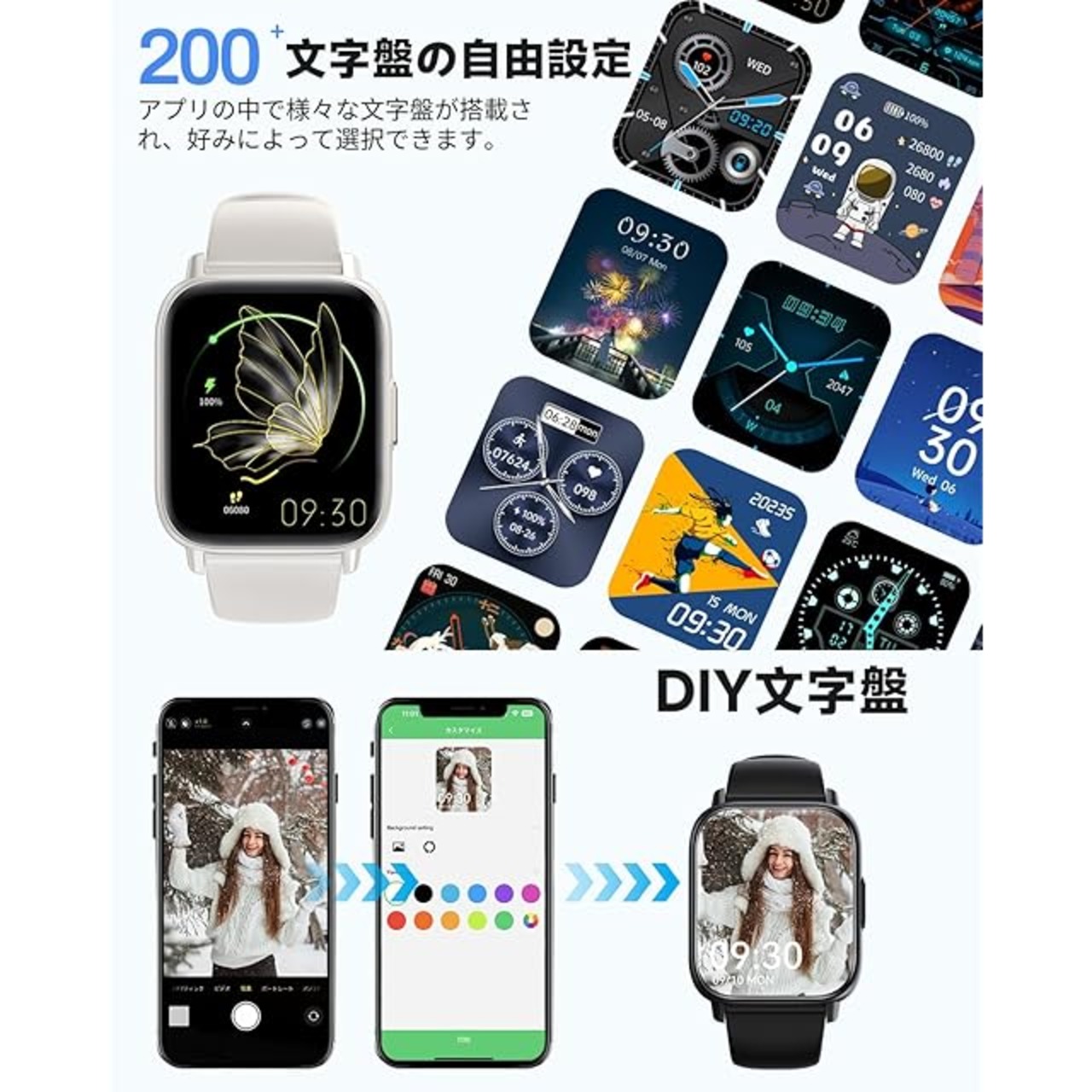 ⌚「文字盤自由設定&100+多種運動モード」smart watchは豊富なスタイルの文字盤があります。そして、お好みの写真(恋人/家族/アイドルなどの写真)を文字盤に使用することもできます。疲れた時でも怒った時でも、smart watchの画面を見ると、力を尽くして頑張ることもできます。smart watchに多種の運動モード(歩行、ランニング、自転車、縄跳び、バドミントン、バスケットボール、サッカー、登山など)があります。smart watchが直接同期して記録できて、アプリで運動の軌跡も直接見ることができます。とても便利です。