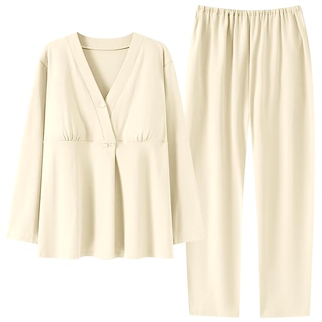 [Kyonuza] マタニティ パジャマ 長袖 綿100 前開き ルームウェア 春秋 簡潔風 肌に優しい かわいい 長袖 部屋着 パッド付き 吸汗通気 大きいサイズ 寝間着 お泊まり服 ゆったり 女性 産前 産後 M 3866^ベージュ | primer
