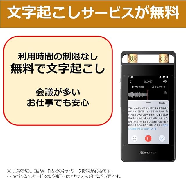 VOITER SR502Jの文字起こしには、Wi-Fiなどネットワーク接続が必要です。文字起こしには、アカウントの作成が必要です。文字起こしサービスはアカウントご登録後無料でご利用いただけます。