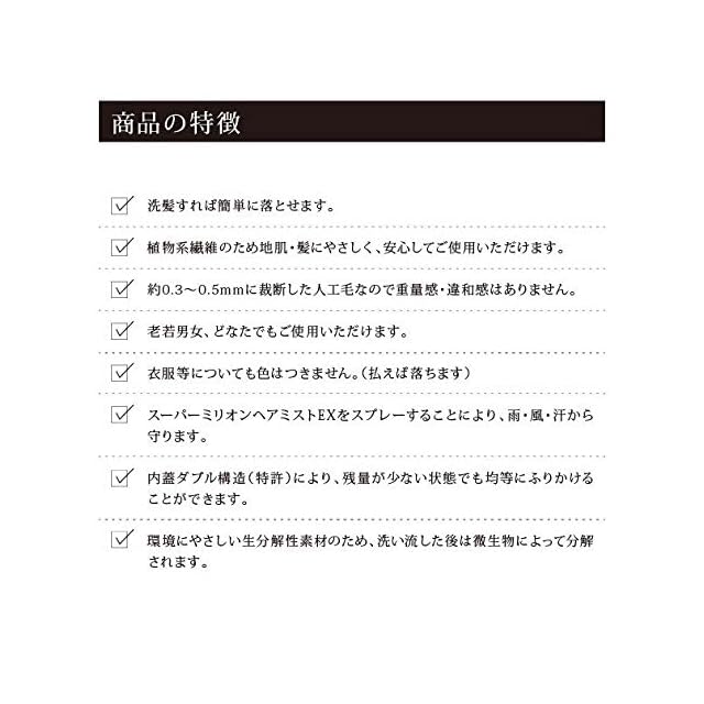 増毛パウダー(植物系抗菌繊維)が静電気で付着して髪を太く見せることにより、自然にボリュームアップしたように見せる商品です。