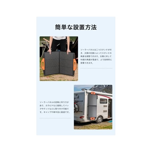 設置簡単:本ソーラーパネルは二つのスタンドが付き、地面に支えて使用できます。四つ段階の調整レベルがあり、最適な角度で太陽光を受けることができ、効率的な充電が可能です。また、吊り穴も付いているので、ベランダやテントなど日当たりのいいと場所に吊り下げての充電もできます。