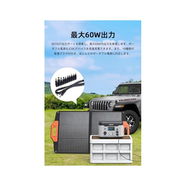60Wの高出力:一つのDC5521出力ポートと一つのUSB-Aポートを搭載したソーラーパネルです。DCポートは最大60Wの高出力に達します。ボータブル電源などDC機器へ急速充電できます。また、10種類の変ブラグが付属し、さまざまなDC機器に対応してアウトドアの他に災害時にも十分な電力が使用できます。