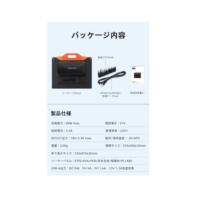 Philips (フィリップス) 60Wソーラーパネル 折りたたみ式ソーラチャージャー 高変換効率 DC/USBポート搭載 ソーラ充電器 太陽光パネル 変換ブラグ ETFE素材 IP65防水防塵 スタンド付き ボータブル電源用 アウトドア/防災/緊急時用DLP8842C