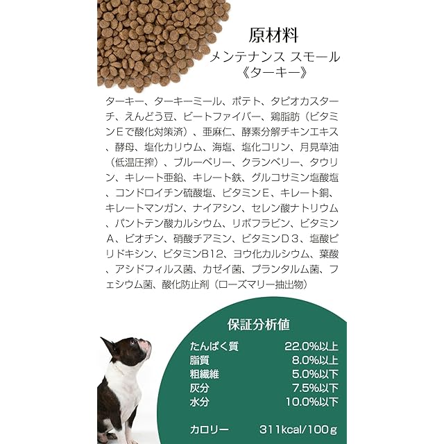 チキンと比べ脂肪分が少なくタンパク質の多いターキー(七面鳥)とポテトを使用。穀物不使用でアレルギーに配慮、シンプルを追求。豊富なタンパク質と低カロリーでしなやかな身体を