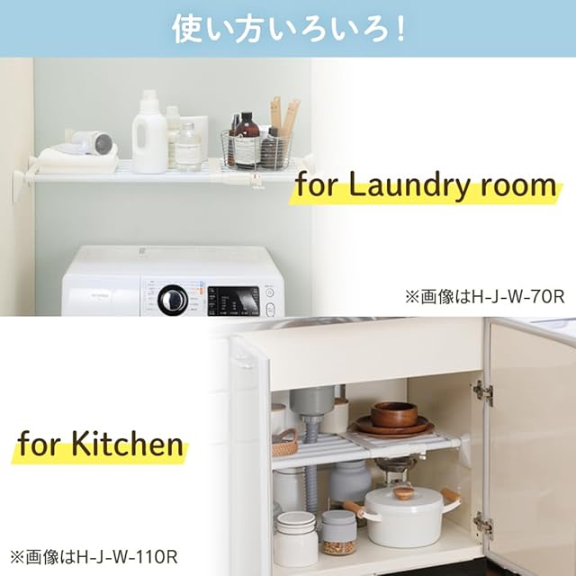【使い方いろいろ】[ランドリーに]洗濯機上などのデッドスペースを収納に。洗剤やタオルなども乗せられる。[キッチンに]小物が多く乱雑になりがちな台所も、棚があればスッキリ。