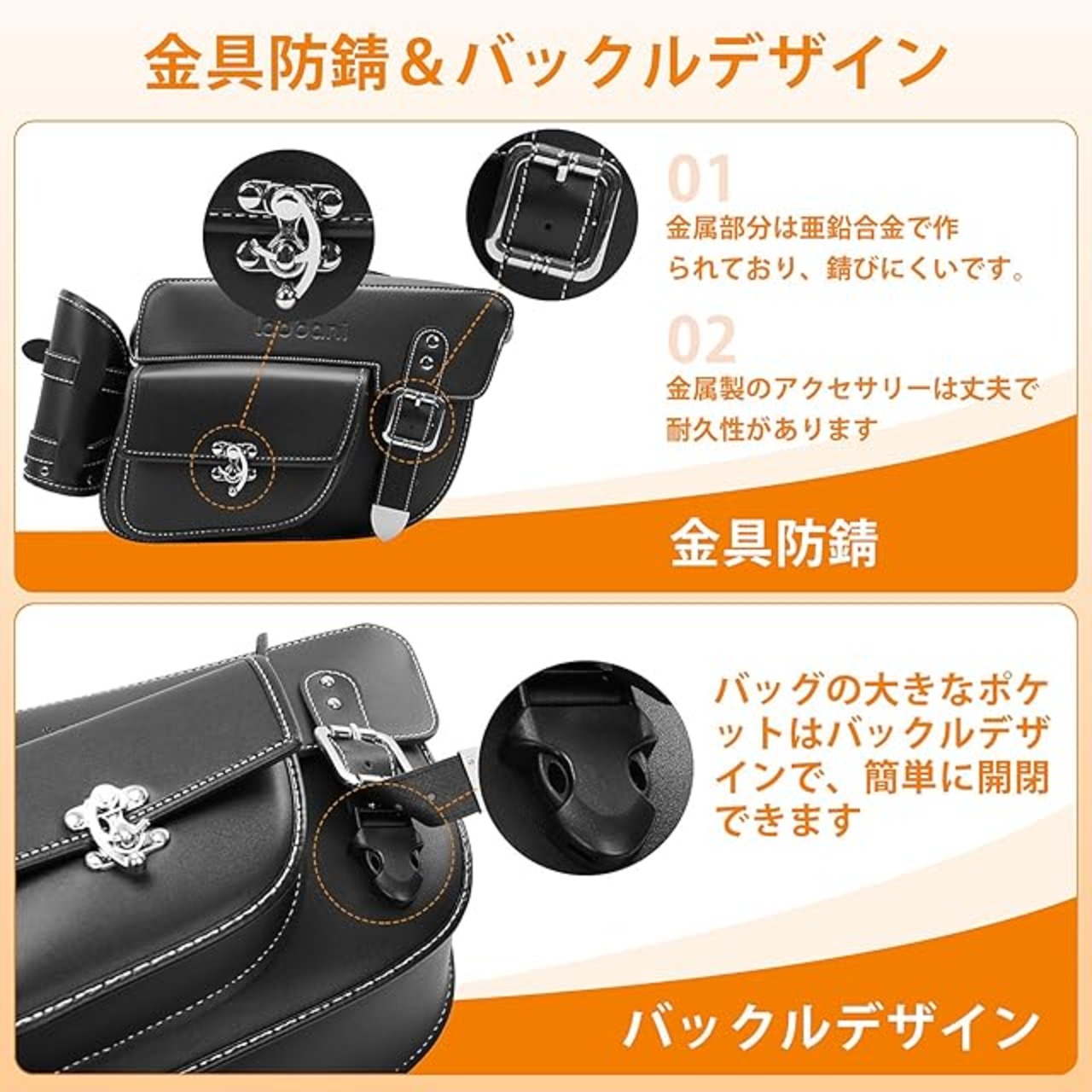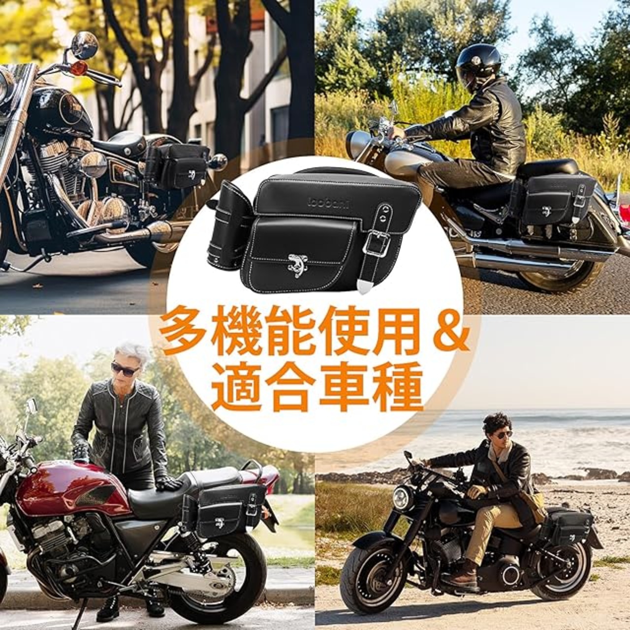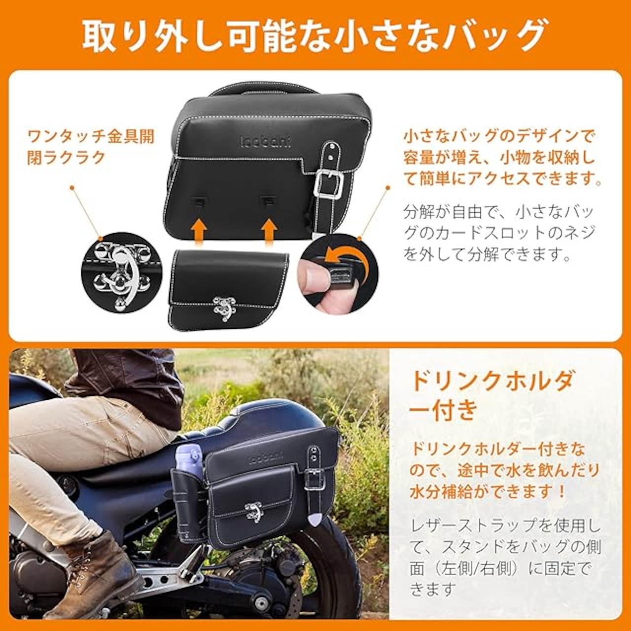 LOOBANI バイク サイドバッグは高品質な合成皮革を使用しているので、雨の日でも大丈夫! 2種類:左側専用&右側専用 撥水仕様:バイク サイドバッグ 防水は合成皮革を使用しており、全体的に防水仕様です。 合成皮革で耐久性&変形しにくい: 合成皮革であっても、本革よりも手入れが簡単です。素材は壊れたり変形したりしにくく、優れた外圧保護を提供し、大切な荷物を守ります。 15L大容量収納:15リットルの大容量で、車載工具、防犯具、雨具、水筒などを収納することができます。また、取り外し可能な小さなバッグも付属しており、手袋、サングラス、鍵、ヘッドフォン、ハンカチなどを収納するのに便利です。 取付簡単:バックルデザインで、簡単に開閉できます。小さなバッグはワンタッチ金具を使用して簡単に開閉できます。 金具防錆:バイク サイドバック 防水の金属部分は亜鉛合金で作られており、錆びにくく、ネジの錆びを防ぐ役割も果たします。 ドリンクホルダー付き:ドリンクホルダー付きなので、途中で水を飲んだり水分補給ができます!レザーストラップを使用して、スタンドをバッグの側面(左側/右側)に固定できます。 底部アップグレード抗高温設計:注意:エキパイに干渉する場合がありますので左側への装着をお勧めします。日帰りツーリング、キャンプ、旅行などに非常に適す。 取り付けは簡単6STEP ① パッケージから付属品を取り出します ② 小さなバッグに手を入れてスロットを締めます ③ ドリンクホルダーを固定 ④ ホルダーをサポートに取り付け、ストラップとサポートで固定します ⑤ 背面の取り付け位置にレザー固定ベルトを通し、長さを調整します ⑥ インストールは非常に簡単に完了します