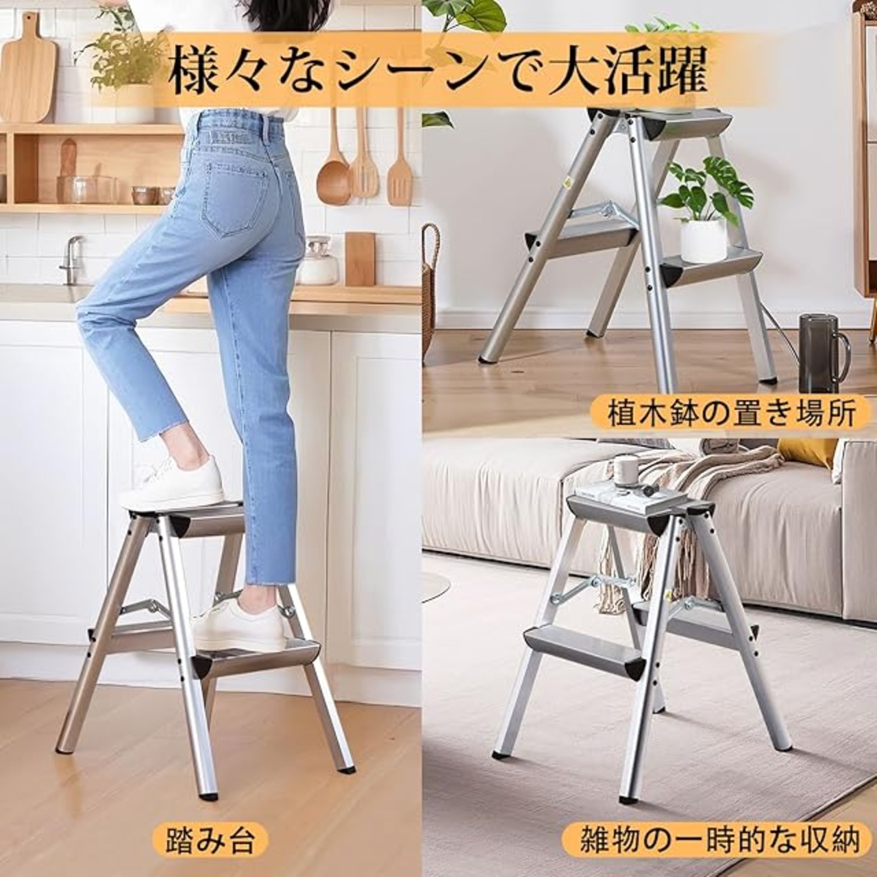 【多用途】家庭内での使用はもちろん、業務用の使用にも耐えうる設計なので、オフィスや工場、アウトドア活動にも対応できます。高所作業や掃除、電球交換など、さまざまなシーンで活躍します。また、植木鉢の配置や雑物の一時的な収納にも便利です。