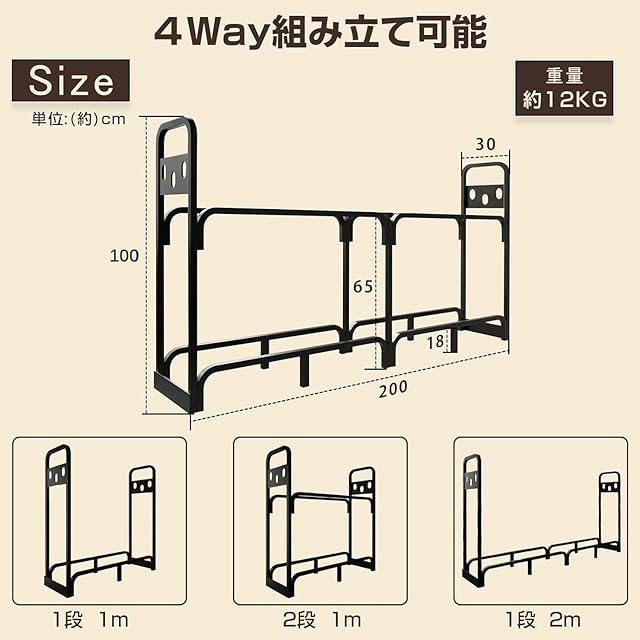 薪ラック ログラック 2段ラック 幅200×奥行30×高さ100cm 耐荷重1200kg 約60束収納 両側ツール収納 スチール製 4Way組立 頑丈 多用途 組立簡単 防錆 安定性 耐久性 薪ストッカー 薪ストーブ ログストッカー 薪ラックスタンド 乾燥 薪保管 キャンプ BBQ レジャー 日本語説明書