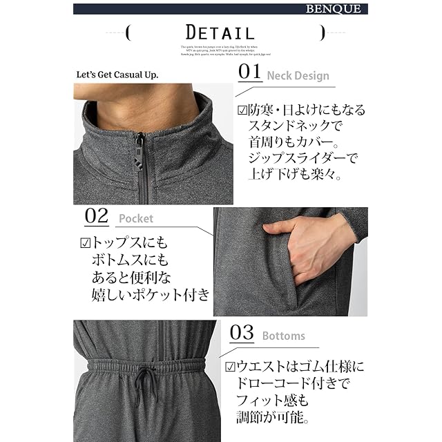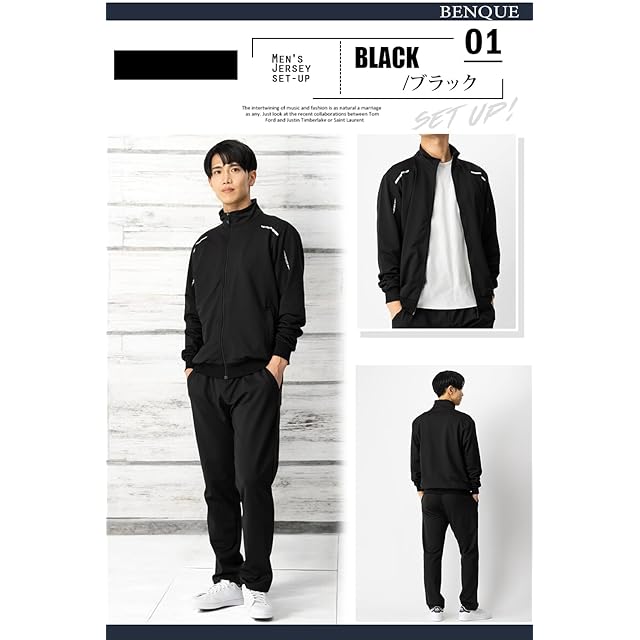 【快適な着心地】こだわりの柔らかい生地で、サラッとした肌触りのジャージ上下セットです。カジュアルかつスタイリッシュなメンズセットアップです。<br> 【スポーツにも部屋着にも◎】適度な伸縮性がある生地なので、ランニングやスポーツシーンはもちろん、着心地が良いため部屋着としても重宝する万能ウェアです。<br> 【Details】トップスとボトムスには便利なポケットを配置。ボトムスのウエストは伸縮性のあるゴムを使用しているので、快適なフィット感を提供します。<br> 【多機能なファブリック】吸汗速乾のジャージ生地のため、吸水性や速乾性に優れ、軽い着心地で汗も乾きやすく、伸縮性もあるのでアクティブな動きに対応。洗濯しても乾きが早く紫外線もカットしてくれるので、屋内、屋外どちらでもお使いいただけます。<br> 【シンプル×おしゃれ】シンプルかつ洗練されたデザインで、トップスはスタンドネックで防寒・首周りの日焼け対策にも◎ ジップスライダーで着脱も楽々。フロントをあけて羽織ってもお洒落なこなれた着こなしをお楽しみ頂けます。 <br> 【あらゆるシーンで使える】運動や練習着のウェアとして、トレーニングやランニング、筋トレやダンスなどのウェアとしてはもちろん、作業着やリラックスしたルームウェア、カジュアルな場面でのお出かけ着にもお使い頂けます。<br> <br> ■素材:ポリエステル 95%,ポリウレタン 5%<br> ■カラー:ブラック、グレー、ネイビー<br> ■サイズ:M,L,XL,2XL<br> <br> トップス<br> 着丈 /胸囲 /肩幅 /袖丈<br> [M] : 66 / 109 / 44 / 66<br> [L] : 68 / 114 / 45.5 / 61.5<br> [XL] :70 / 119 / 47 / 63 <br> [2XL] :72 / 124 / 48.5 / 64.5 <br> <br> ボトムス<br> 総丈 /ウエスト(ゴム仕様) /ヒップ<br> [M] : 97 / 73~ / 106 <br> [L] : 100 / 76~ / 110<br> [XL] :102 / 79~ / 114<br> [2XL] :104 / 82~ / 118<br>